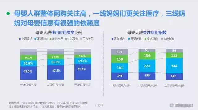 母嬰人群整體網(wǎng)購關(guān)注高,一線城市媽媽們更關(guān)注醫(yī)療,三線城市媽媽對母嬰信息有很強(qiáng)的依賴度。
