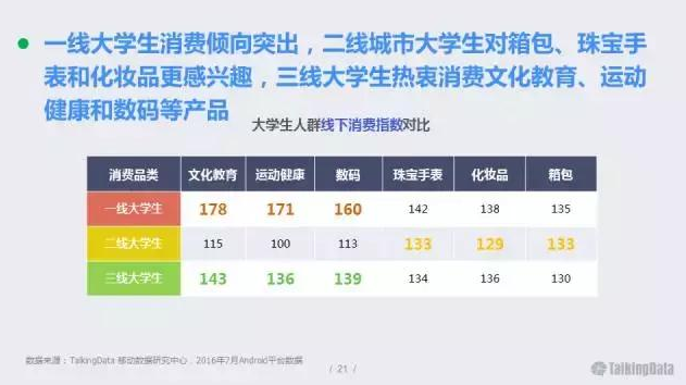 一線大學(xué)生消費(fèi)傾向突出,二線城市大學(xué)生對箱包、珠寶手表和化妝品更感興趣,三線大學(xué)生熱衷消費(fèi)文化教育、運(yùn)動健康和數(shù)碼等產(chǎn)品。