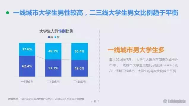 截止2016年7月,大學(xué)生人群在不同級別城市分布中,一線城市大學(xué)生男性比例達(dá)到62.4%;而在二線和三線城市,大學(xué)生的男女比例趨于平衡