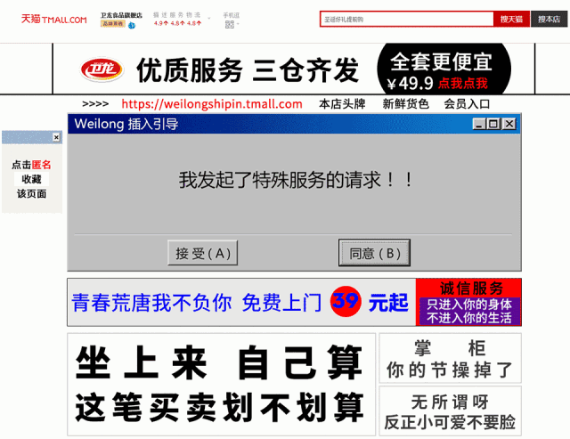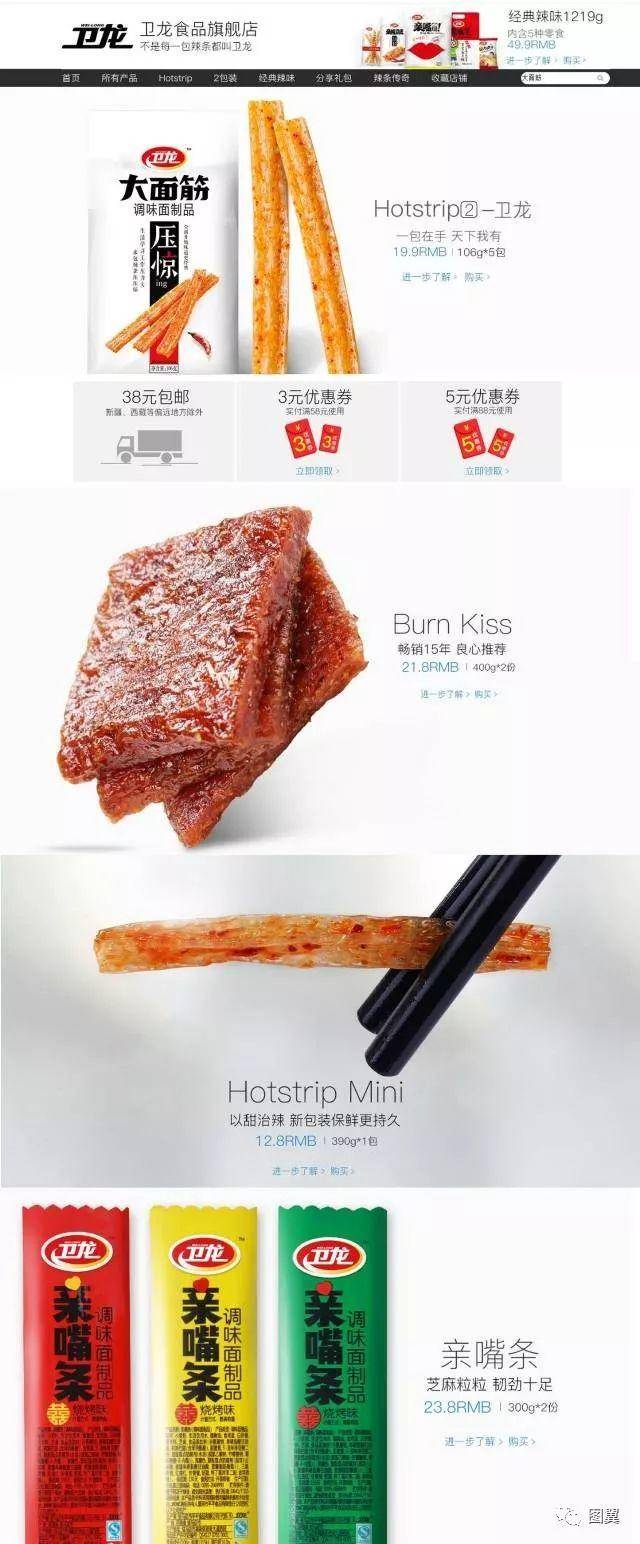 衛龍的店鋪設計在琳瑯滿目的某寶上,算是“業余”玩家,和“美”總是有段距離,甚至還格格不入。