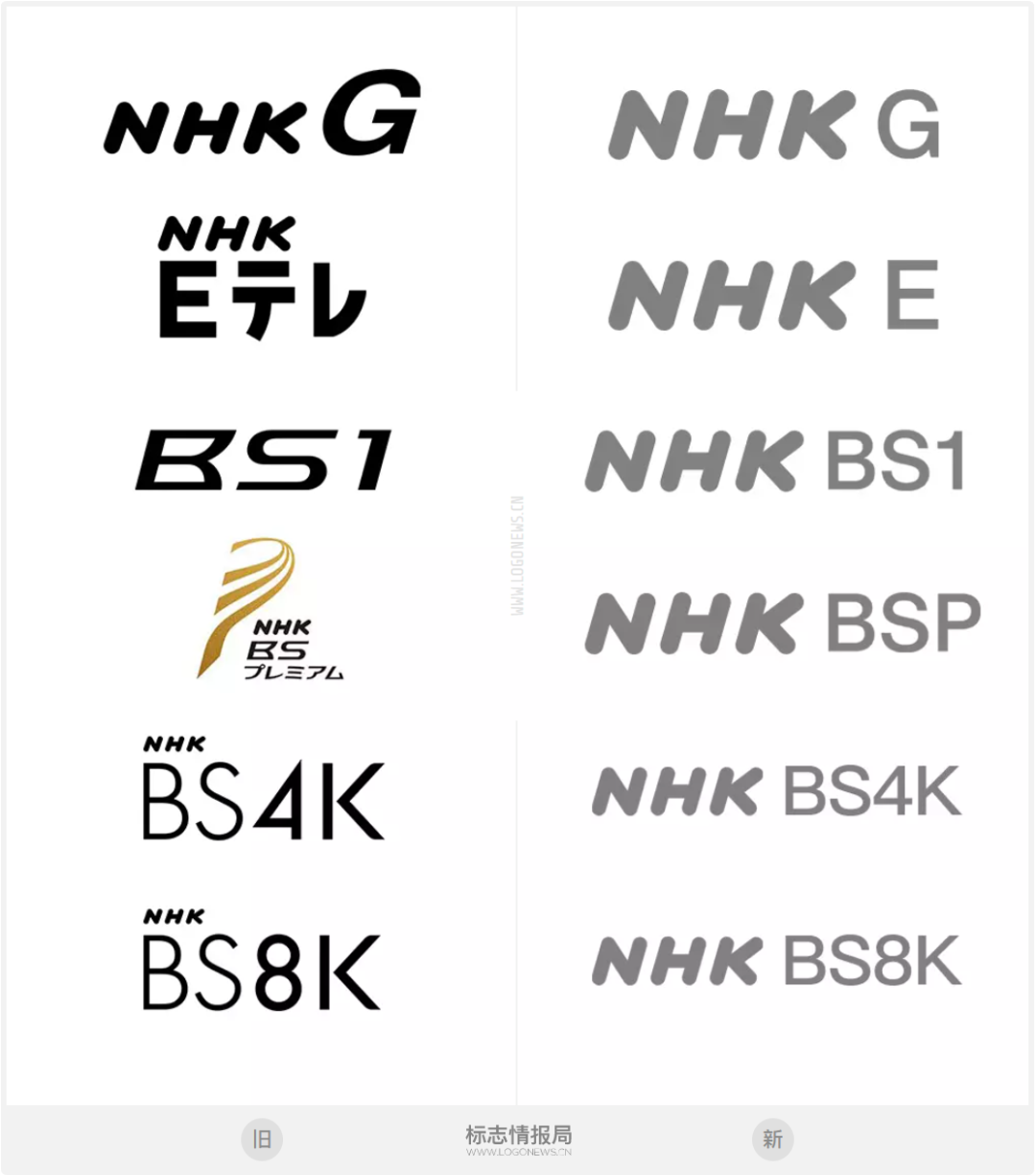 為了更直觀對比,我們找到了新舊高清版LOGO,可以看出所有臺(tái)標(biāo)統(tǒng)一為新版「NHK」字標(biāo),后面的頻道名稱則使用常規(guī)的無襯線文字。
