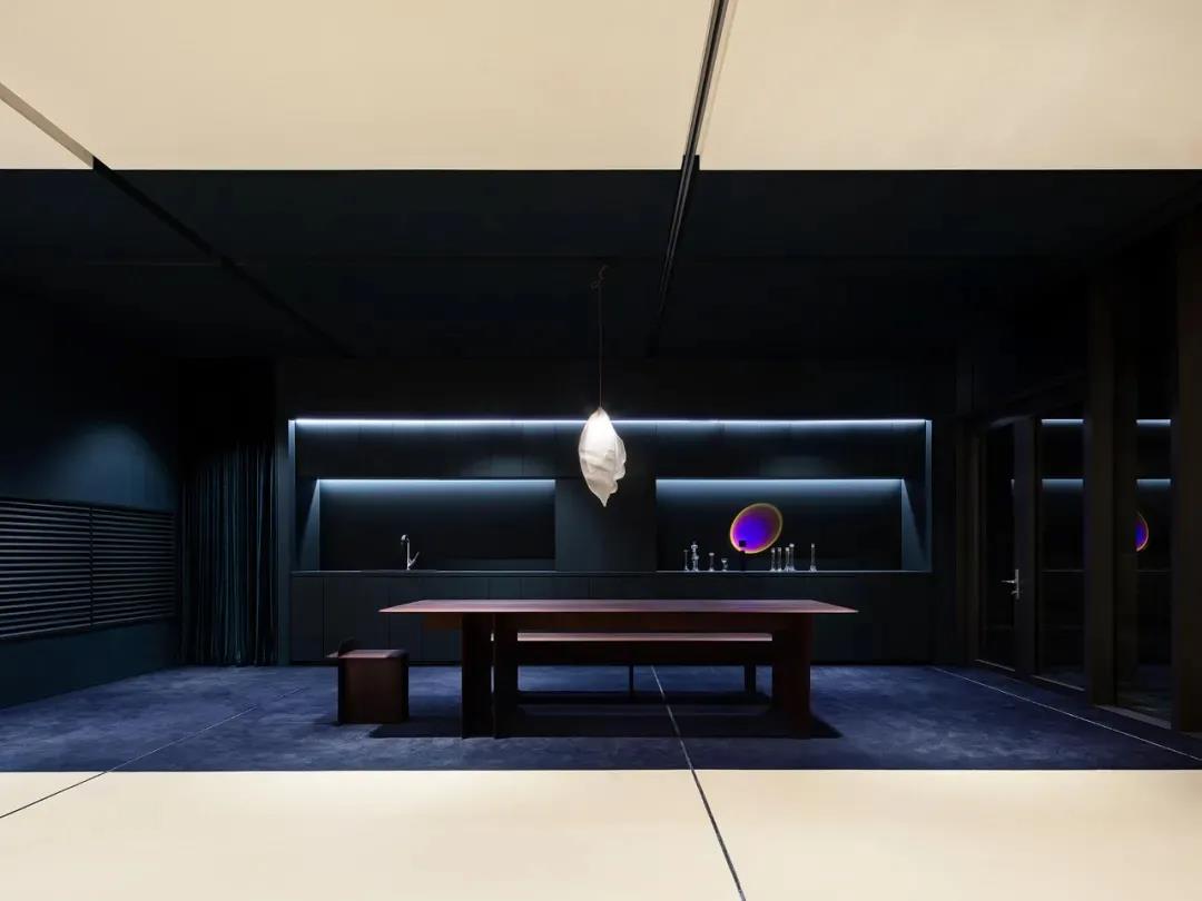 靈感于東方傳統(tǒng)建筑的大屋頂,斜坡屋頂灑下的光線,與暗黑系的室內(nèi)肌理形成了對(duì)比,更顯安靜、肅穆。