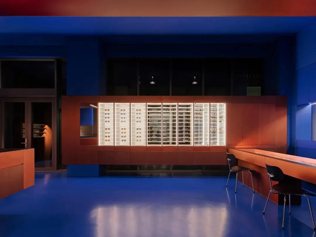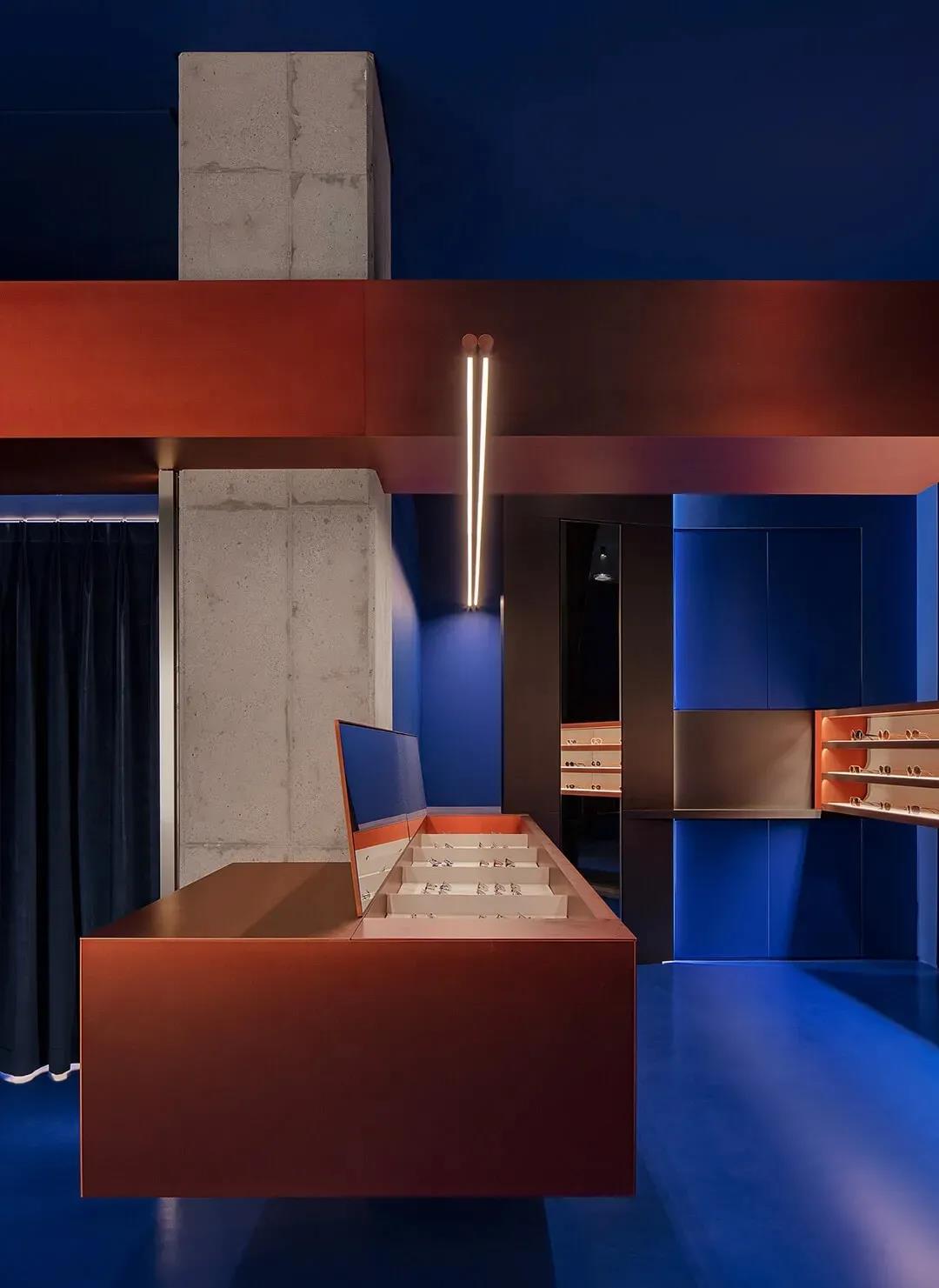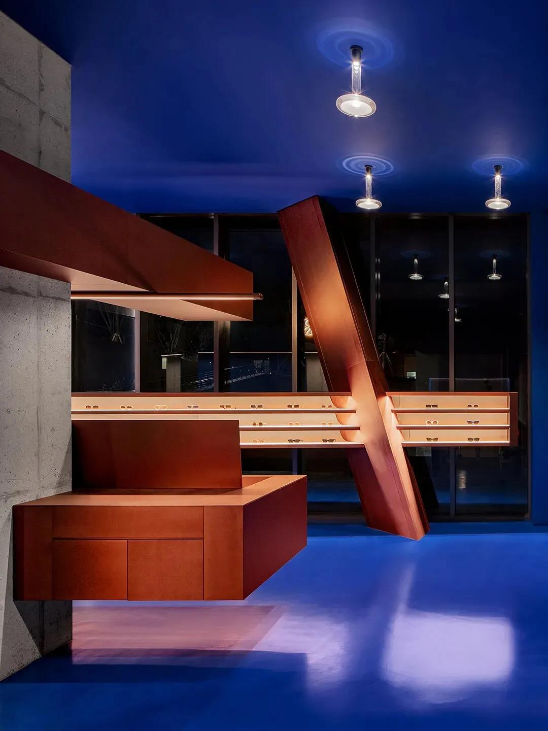“為不同的環(huán)境構(gòu)建理想的結(jié)構(gòu)。這是一個(gè)關(guān)于眼鏡的故事,而不是關(guān)于建筑的故事。”設(shè)計(jì)師藍(lán)色與赤陶色的強(qiáng)烈對(duì)比令人印象深刻,該案例與意大利頂級(jí)照明品牌Viabizzuno合作。