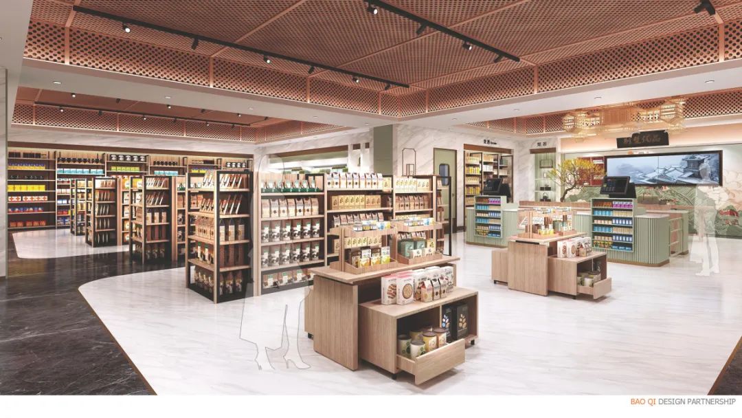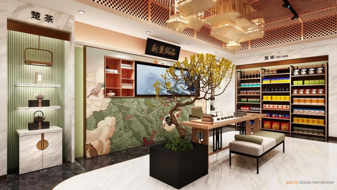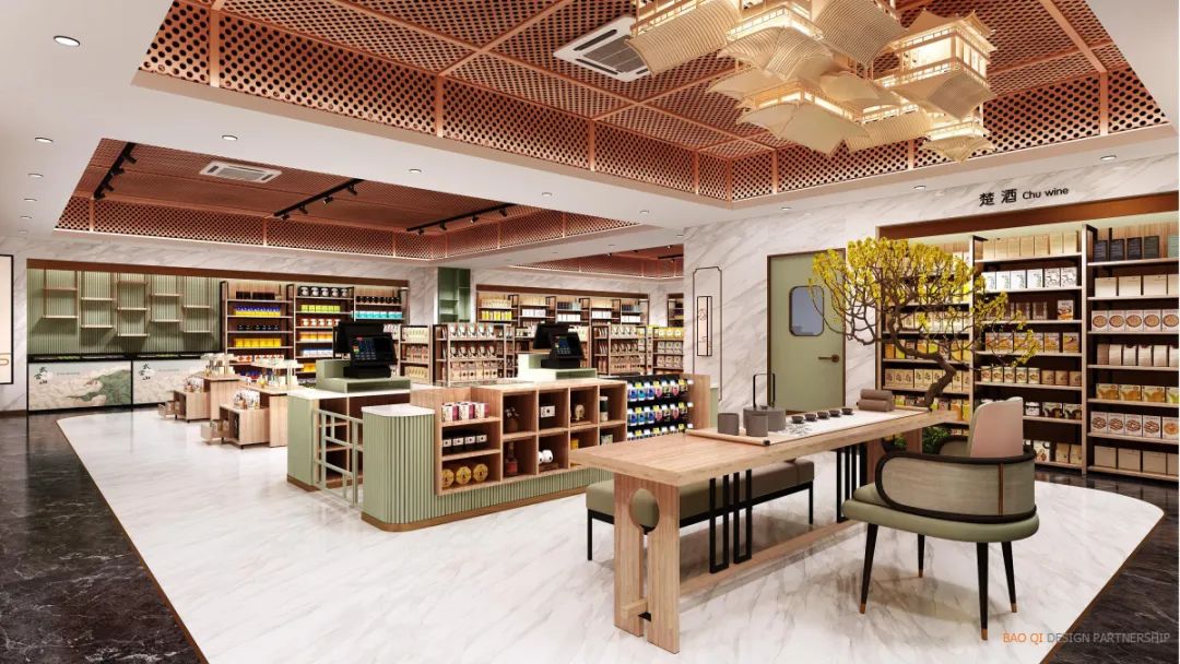 寶騏設(shè)計(jì)師對(duì)面積相對(duì)較大的武當(dāng)山服務(wù)區(qū)北區(qū)門(mén)店進(jìn)行著重設(shè)計(jì),為“荊楚優(yōu)品”劃分出了一塊人文氛圍濃厚的半圍合式空間,楚味、楚酒、楚茶三類(lèi)商品于此分區(qū)展示。