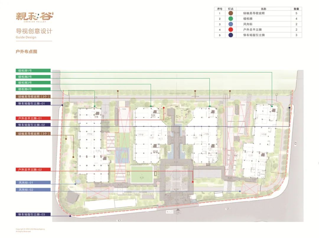 本次導視設計的服務內容包括園區導視、停車指引、樓棟牌、前臺導視、前廳布局導視、功能房導視、房間門牌、電梯及安全通道導視、溫馨提示標語等室內室外一系列導視設計。