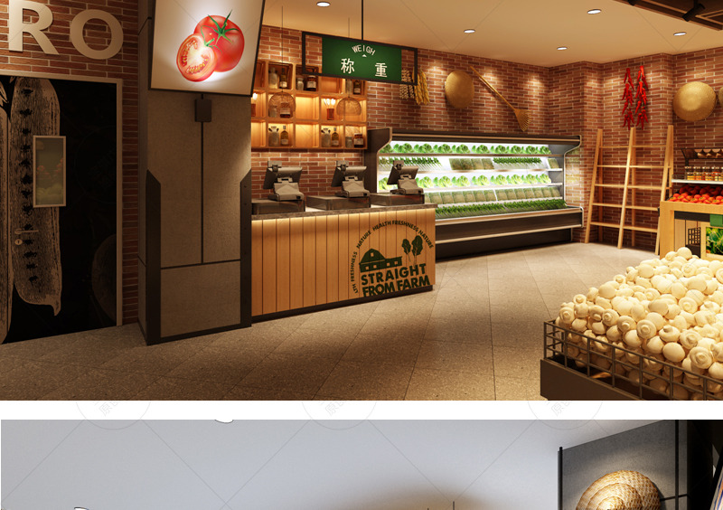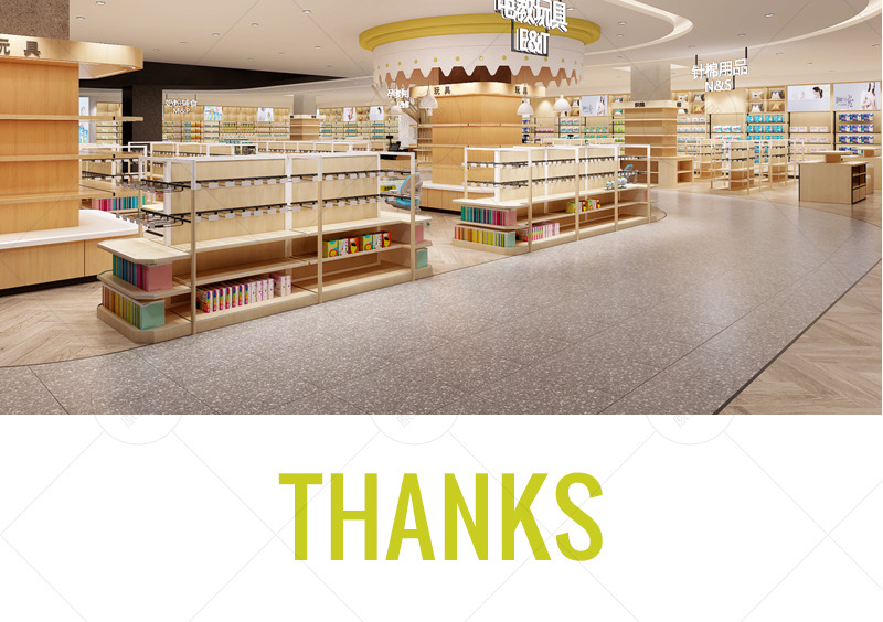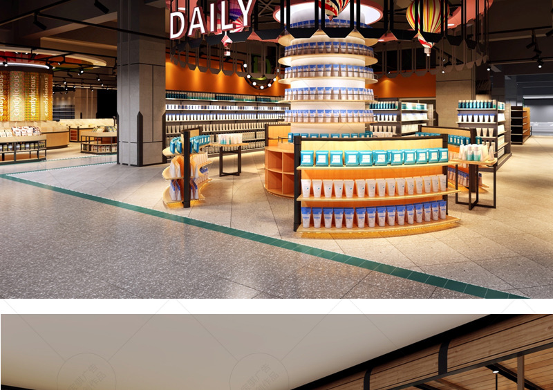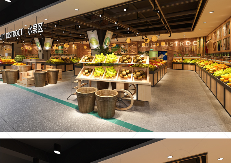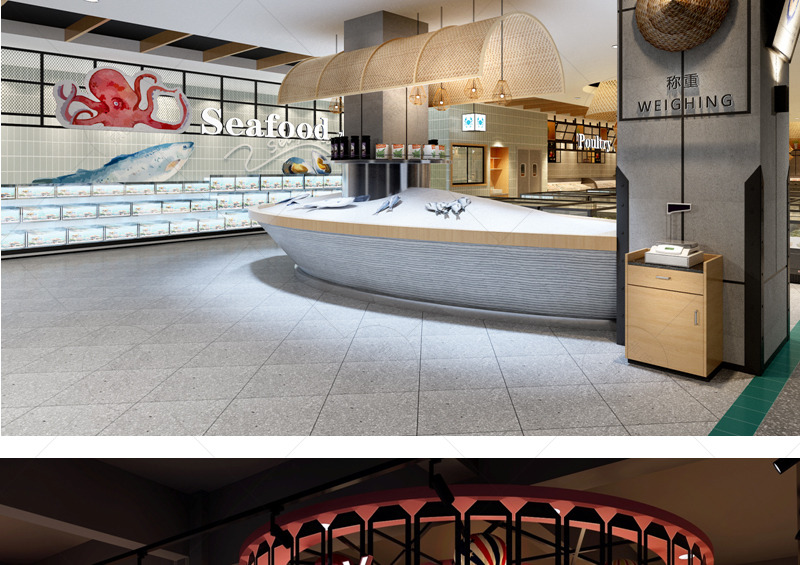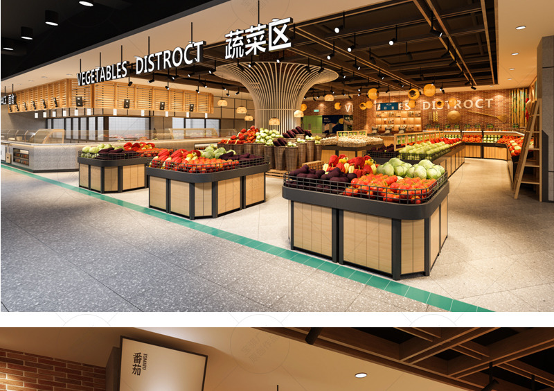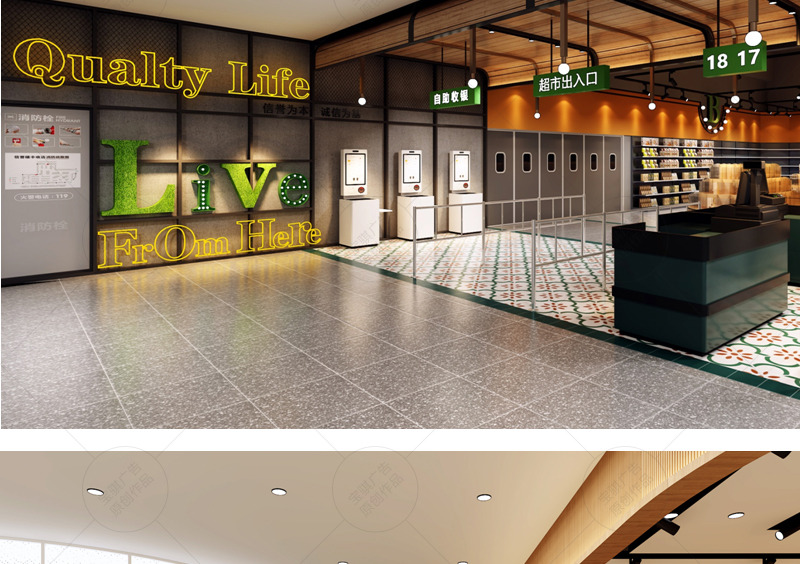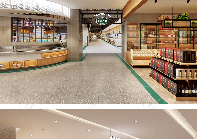 信譽樓百貨集團第一家獨立超市店面,項目面積達到5000平方米。在平面布置上打造“館”的概念,合理規避和利用消防分區及柱網結構,豐富空間層次,增加賣場的可看性及可逛性。